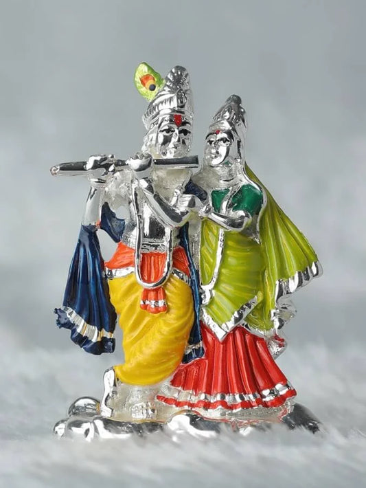 Radha Krishna Silver Plated Idol with Hand Painted Artwork
