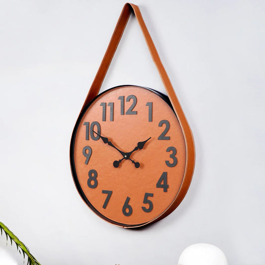 Round Black Framed Engineered Wood Wall Clock with Leather coating